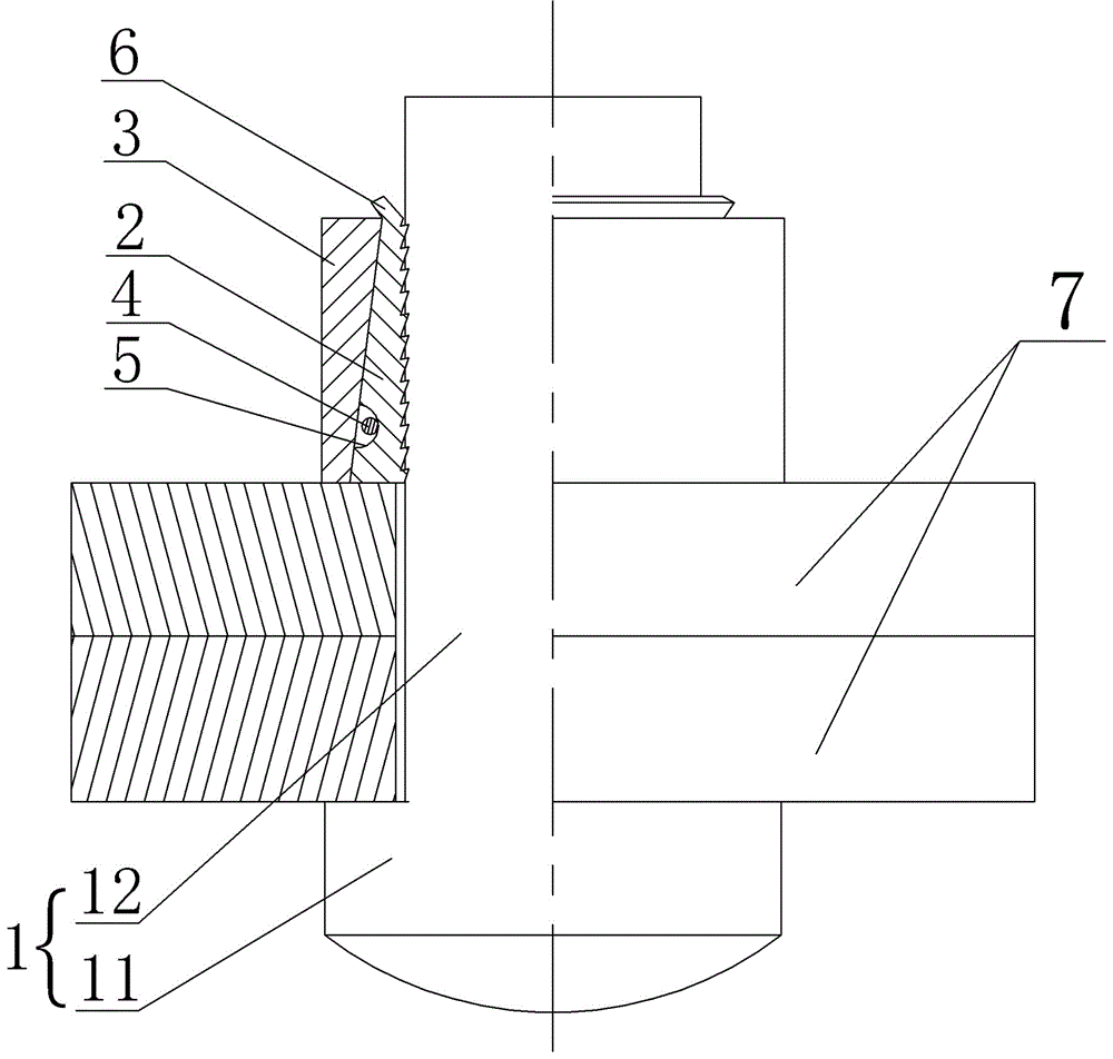 (2)本發明內套筒與釘身過盈配合,且沿釘的長度方向切開為至少兩半,并通過鎖緊圈拼合,設計巧妙,能夠在一定范圍內使內套筒與不同直徑的釘相配合,適用性強,并且使內套筒套在釘上的動作更加方便、省力;本發明的鎖緊圈為環形線圈疊繞而成的圓環,能夠根據釘直徑的不同調整圓環的直徑,使內套筒既能夠與不同直徑的釘相配合,又保證了套在釘上的內套筒對釘的壓緊;本發明在內套筒外壁上開有環形槽,鎖緊圈在環形槽中將內套筒圈緊,能夠有效地防止鎖緊圈的軸向位移;